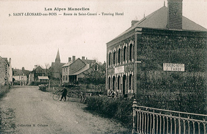 Une vingtaine d’années plus tôt, en 1904, il avait également donné naissance au syndicat d’initiatives des Alpes-Mancelles et construit en 1906 « Le Touring Hôtel » dont Alphonsine Lebreton était devenue propriétaire en 1929. Une femme étonnante, « féministe » avant l’heure et indépendante au point d’effectuer alors qu’elle avait plus de soixante-dix ans de nombreux voyages à bicyclette pour se rendre de Saint-Léonard-des-Bois au Mont-Saint-Michel et même à Lourdes, faisant étape le soir dans des Routiers où elle jouait aux cartes en compagnie des camionneurs de passage. Alphonsine fut aussi propriétaire un peu plus tard d’une maison dénommée « Le cheval Blanc » qui fut transformée ultérieurement par ses enfants en crêperie. A cette époque Saint-Léonard-des-Bois comptait au centre du village un autre hôtel qui disposait, chose singulière, d’une « chambre noire » utilisée par des photographes de passage qui y développait leurs pellicules.